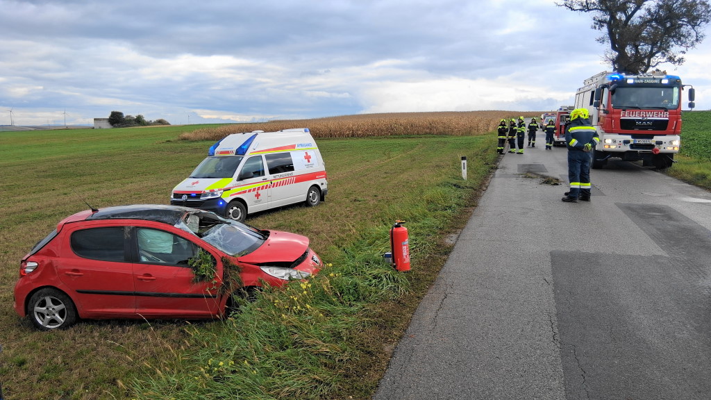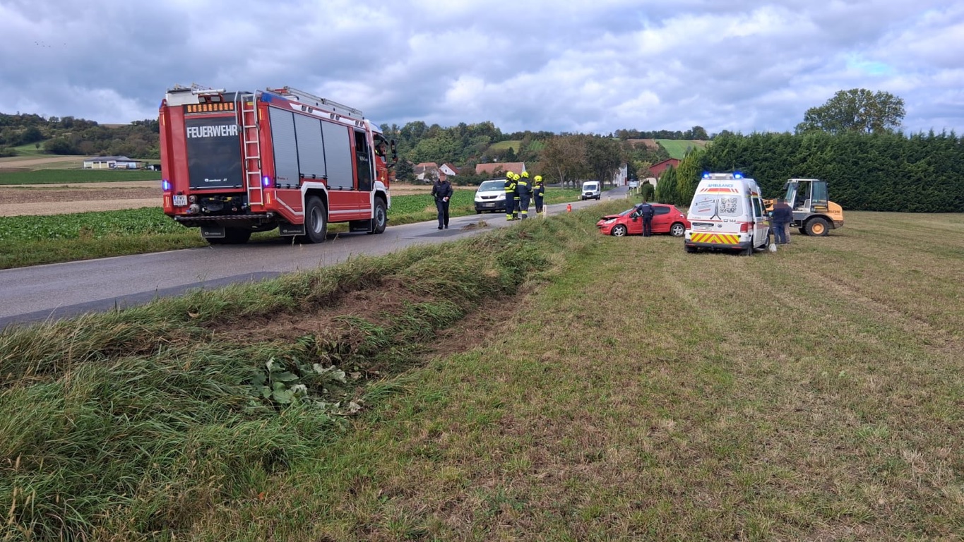 Am 7. Oktober wurden wir um 12:38 Uhr zu einem Einsatz „T2: Verkehrsunfall – Menschenrettung“ nach Kleinrust gerufen. Ein Auto war von der Fahrbahn abgekommen und hatte sich über die Böschung hinunter überschlagen, kam aber glücklicherweise auf den Rädern zu stehen.