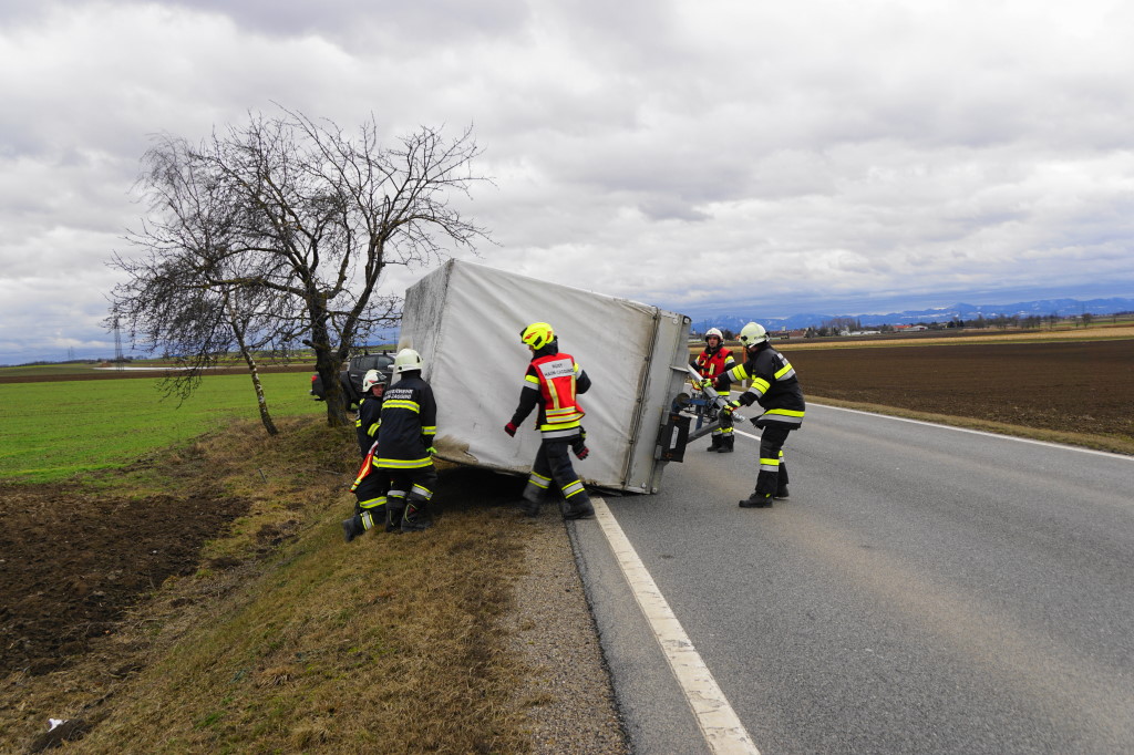 Ein Richtung Rottersdorf fahrender Pickup mit hohem unbeladenen Autoanhänger war eigenen Angaben zufolge wegen dem starken Seitenwind langsam unterwegs, trotzdem kippte der Anhänger seitlich um.