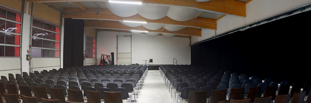 Nach der Räumung der Halle samt Reinigung und dem Aufbau der Bühne wurden die Wände mit Stoffbahnen verkleidet, um die Akkustik weiter zu verbessern. Daneben wurden die notwendigen Sessel aufgestellt und auch der Saal für die Besucher vorbereitet.